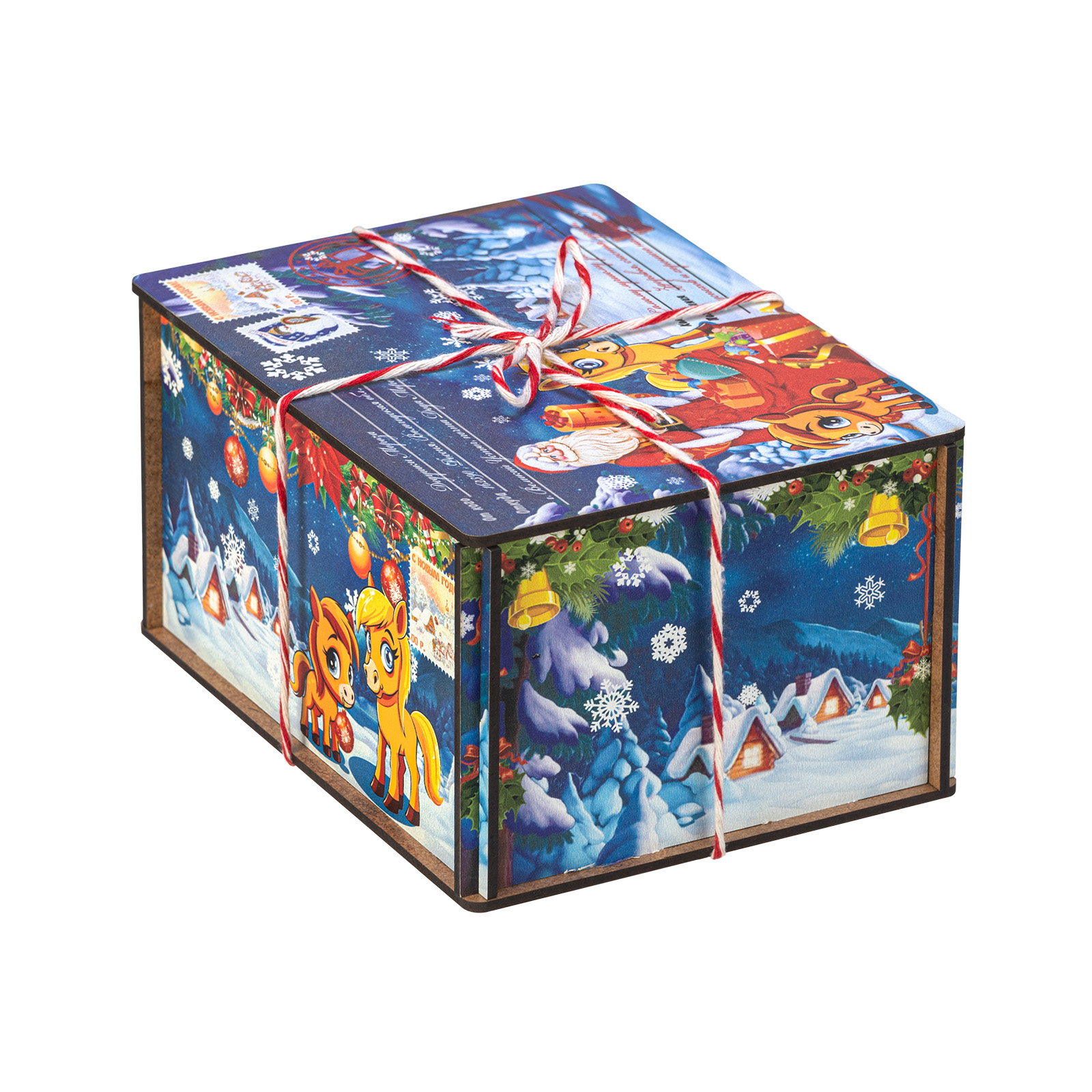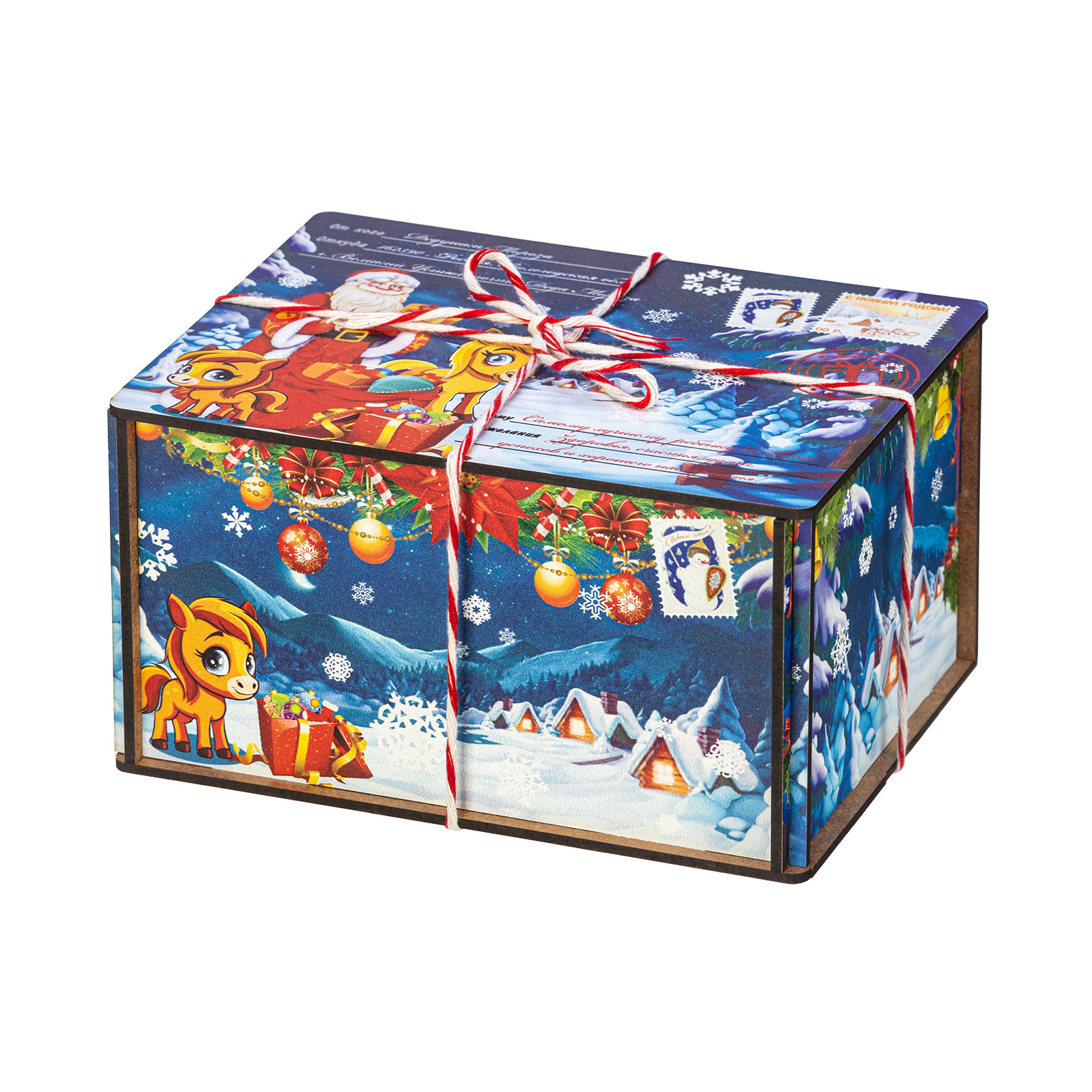 Помните, как вы радовались, получая посылку с гостинцами от дальних родственников? Именно такие искренние яркие эмоции способен вызвать подарок “Посылка от сказочной лошадки”! Это небольшой подарочный набор, помещенный в деревянную коробочку, со всех сторон украшенную пестрыми иллюстрациями с узнаваемыми праздничными символами: Дед Мороз с подарками, еловая ветка с цветными шарами, маленькая очаровательная лошадка. Сверху подарок перетянут красно-белой веревочкой шнурком, который так и хочется поскорее развязать, чтобы посмотреть на содержимое этой посылки! Внутри бережно хранятся вкусные разнообразные лакомства и небольшой памятный сувенир в виде символа наступающего года. Такой подарок прекрасно подойдет к любому новогоднему торжеству или походу в гости!