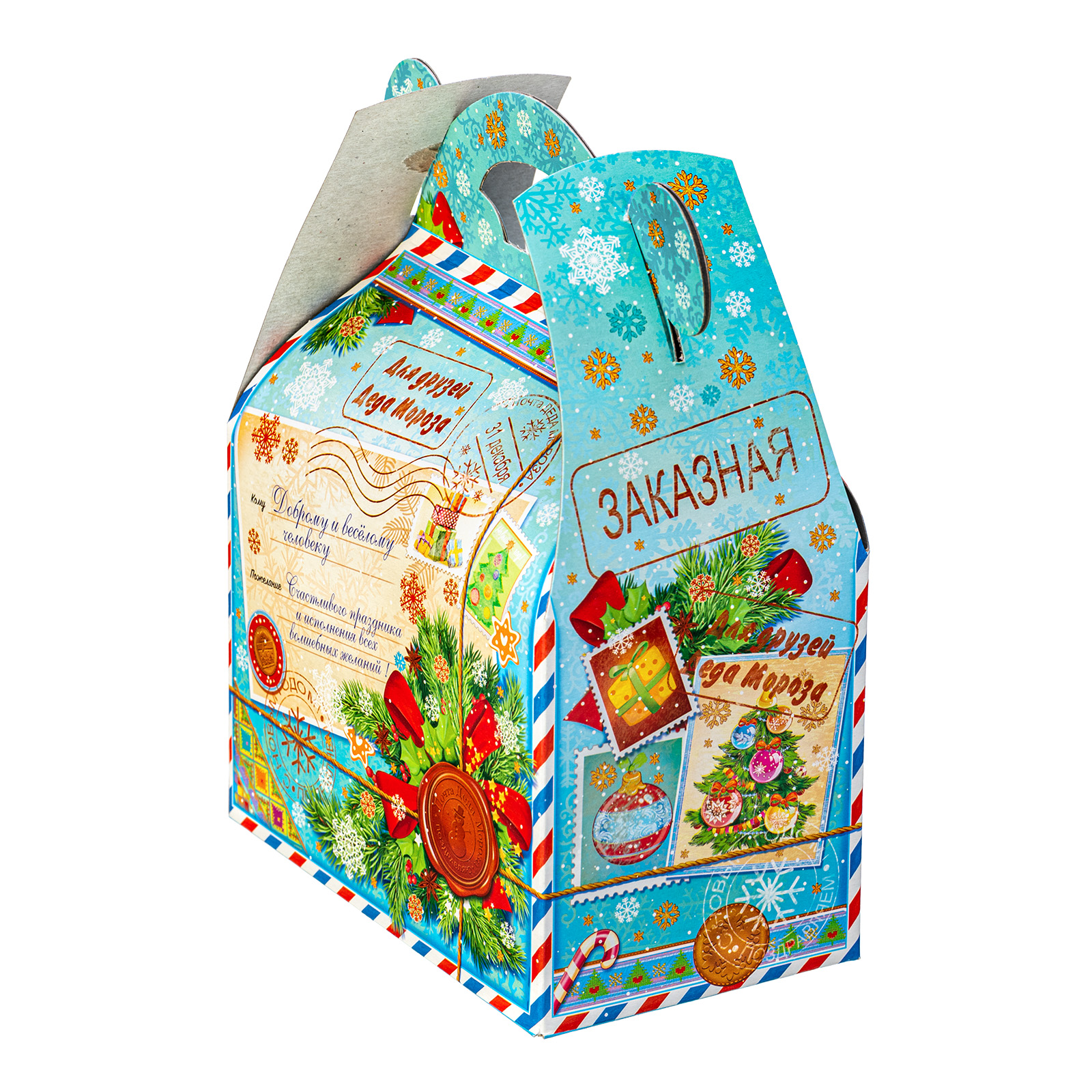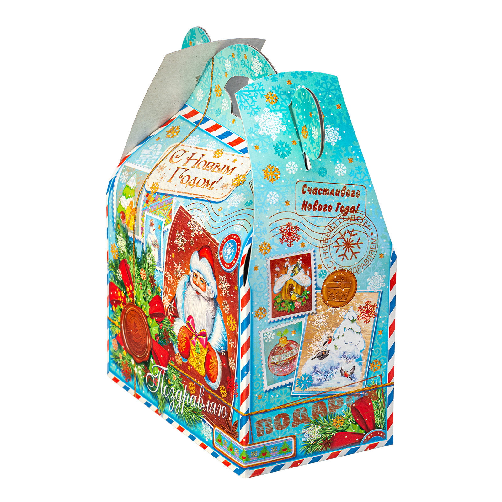 Новогодние сладкие подарки в картонной упаковке актуальны и по сей день. Набор “Сундучок открытки” - это универсальный выбор, который прекрасно подойдет как для ребенка, так и для совершенно взрослого сластены. Подарочная упаковка прекрасно сочетает в себе яркие праздничные иллюстрации и приятный нежно-голубой фон. Внутри набора хранятся 500 грамм самых разнообразных сладостей от ведущих кондитерских предприятий и небольшой памятный сувенир, который надолго сохранит в себе волшебную атмосферу новогодних праздников.